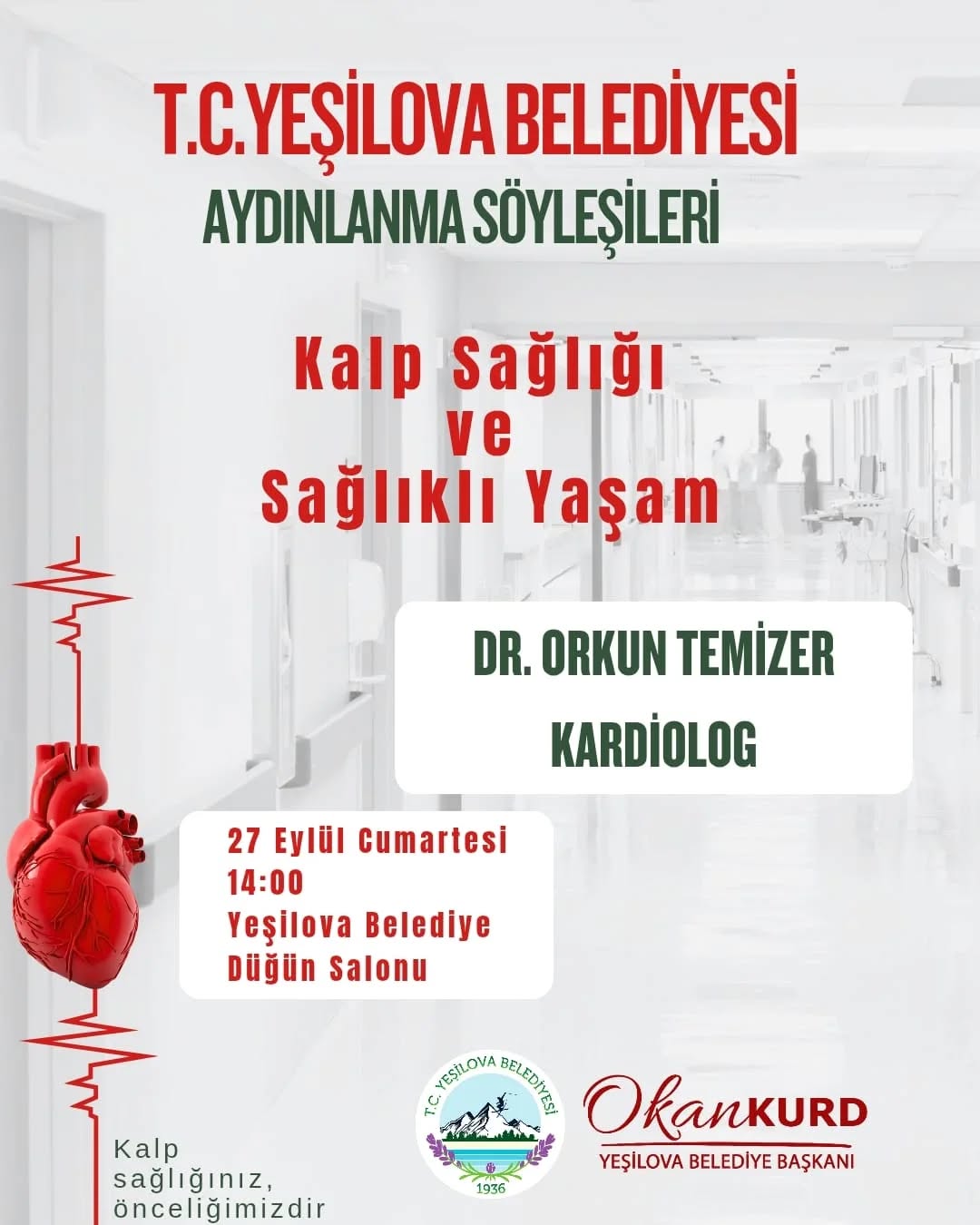 Belediye Başkanı Okan Kurd, tüm Yeşilovalıları söyleşiye davet ederek, “Kalp sağlığınız bizim için önceliklidir” mesajını paylaştı.